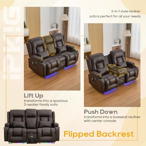 IPKIG 67" Power Reclining Loveseat Sofa, Electric Home Theater Seating with Console/4 Colors Ambient Lighting/Bluetooth Speakers/USB Ports/Built-in Outlets (Brown, Loveseat Recliner)