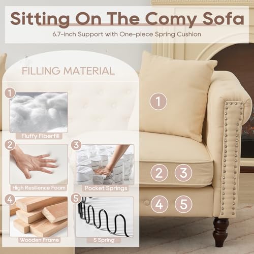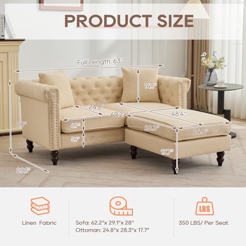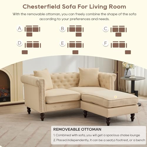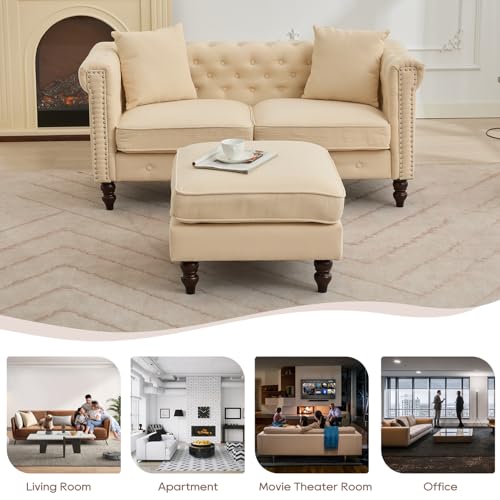SofasIPKIG Chesterfield Sofa with Ottoman – Mid-Century Modern Linen Fabric Couch Upholstered Loveseat Sofa w/2 Throw Pillows, Button Tufted Backrest, Scroll Arms and Nailhead for Living Room, Bedroom